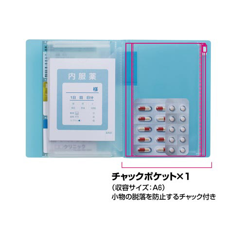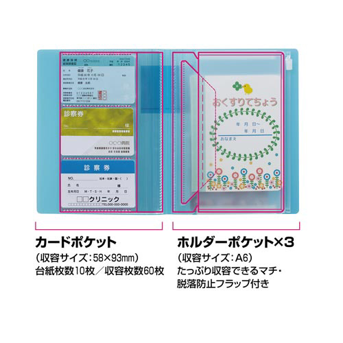 背幅が変わる/書類の量に合わせて背幅が変わるので、いつでもコンパクトに収容できる3種のポケットで、カードやA6 サイズの冊子(おくすり手帳など)、小物(ペンなど)をまとめて整理することができる