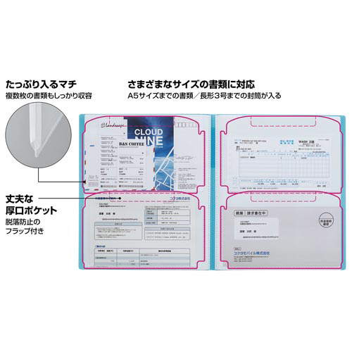 背幅が変わる/書類の量に合わせて背幅が変わるので、いつでもコンパクトに収容できる丈夫なマチ付きポケットで、厚手の冊子も収容可能付属のインデックス用ラベルを活用すれば、検索しやすい見出しになる