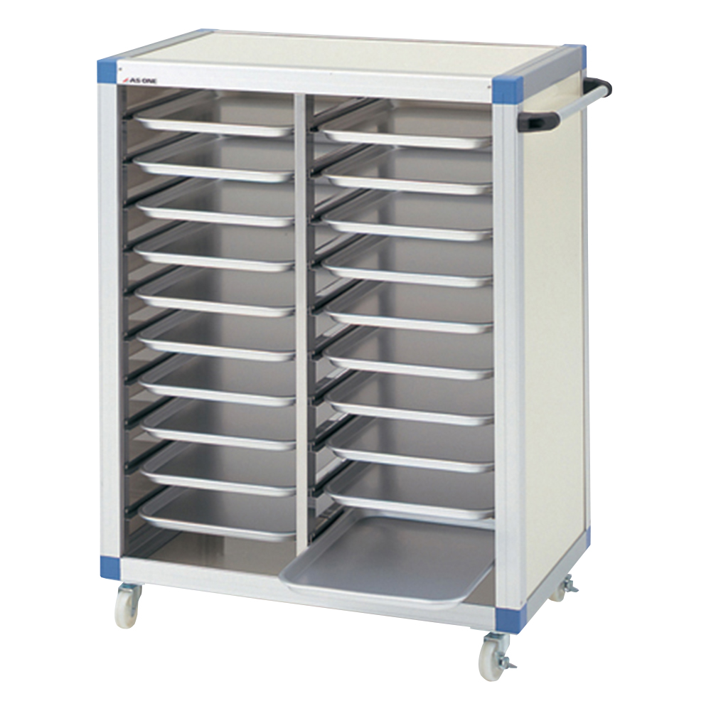 ●抜き差し可能なアルミトレーを棚板にしたキャスター付きワゴンです。
