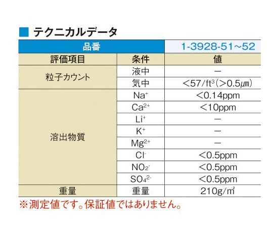 ●抽出イオン:Na、0.14ppm以下(μg/g)、Ca、10ppm以下(μg/g)、CL、0.5ppm以下(μg/g)、NH4、1ppm以下(μg/g)、NO2、<0.5ppm以下(μg/g)、SO4、0.5ppm以下(μg/g)