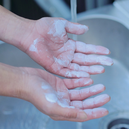 ●スクラブ剤(テウチグルミ殻粒)を使用し、手の爪やシワまで行き届きます。