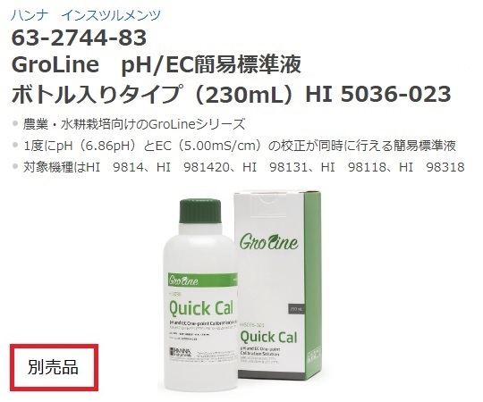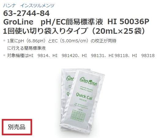 ●付属品:本体(電極はセット済み)、pH電極交換用スティック、電極保護キャップ、LR-44ボタン電池4個(本体にセット済)、pH/EC簡易標準液4袋、電極洗浄液1袋、日本語取扱説明書他