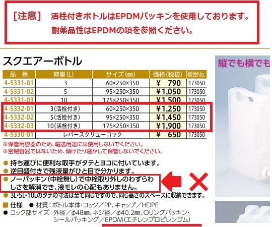 ●材質:ボトル本体・コック/PP(ポリプロピレン)、キャップ/HDPE(高密度ポリエチレン)、Oリングパッキン・シールパッキング/EPDM(エチレンプロピレンゴム)