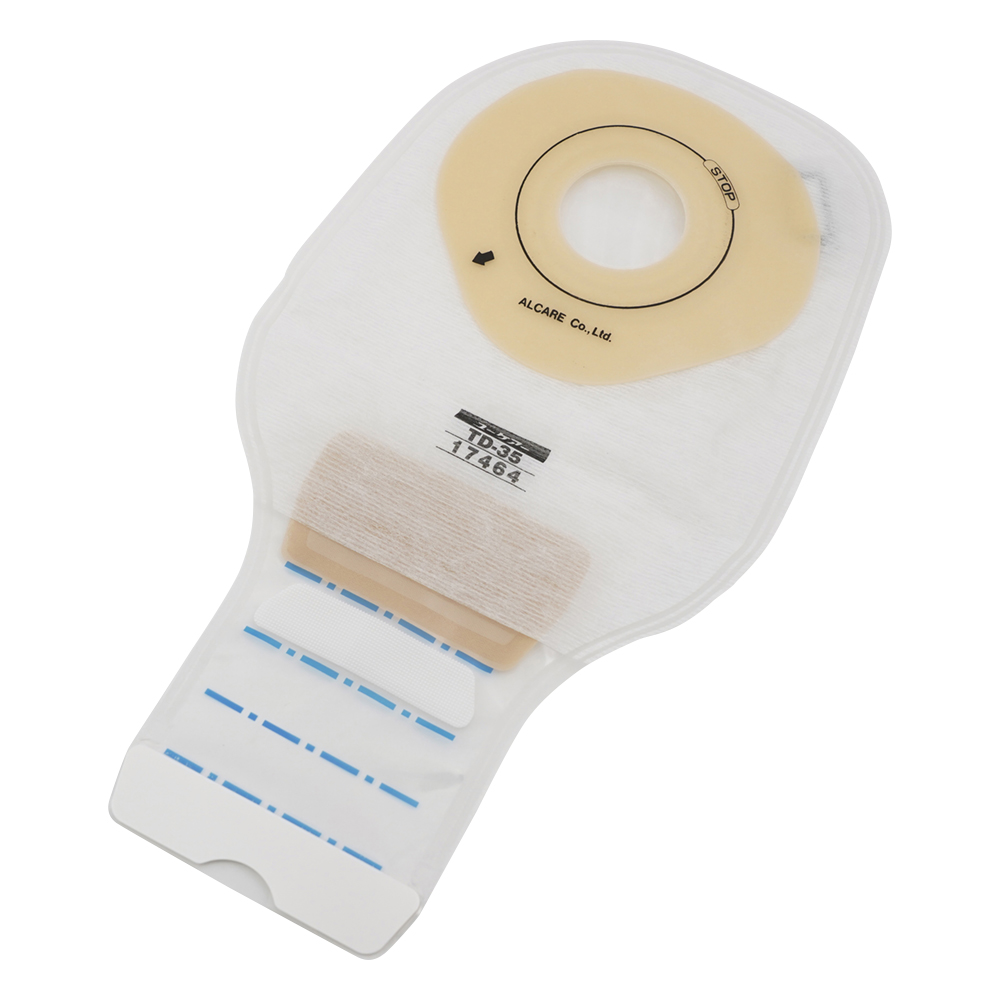 ●消化管ストーマ用。全体が平らな面板で、高さのあるストーマに適しています。下部に便排出口があるストーマ袋です。交換目安は2日。