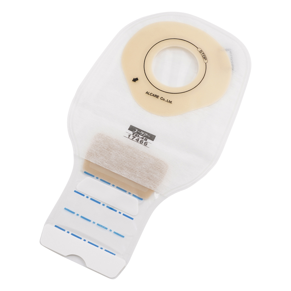 ●消化管ストーマ用。全体が平らな面板で、高さのあるストーマに適しています。下部に便排出口があるストーマ袋です。交換目安は2日。
