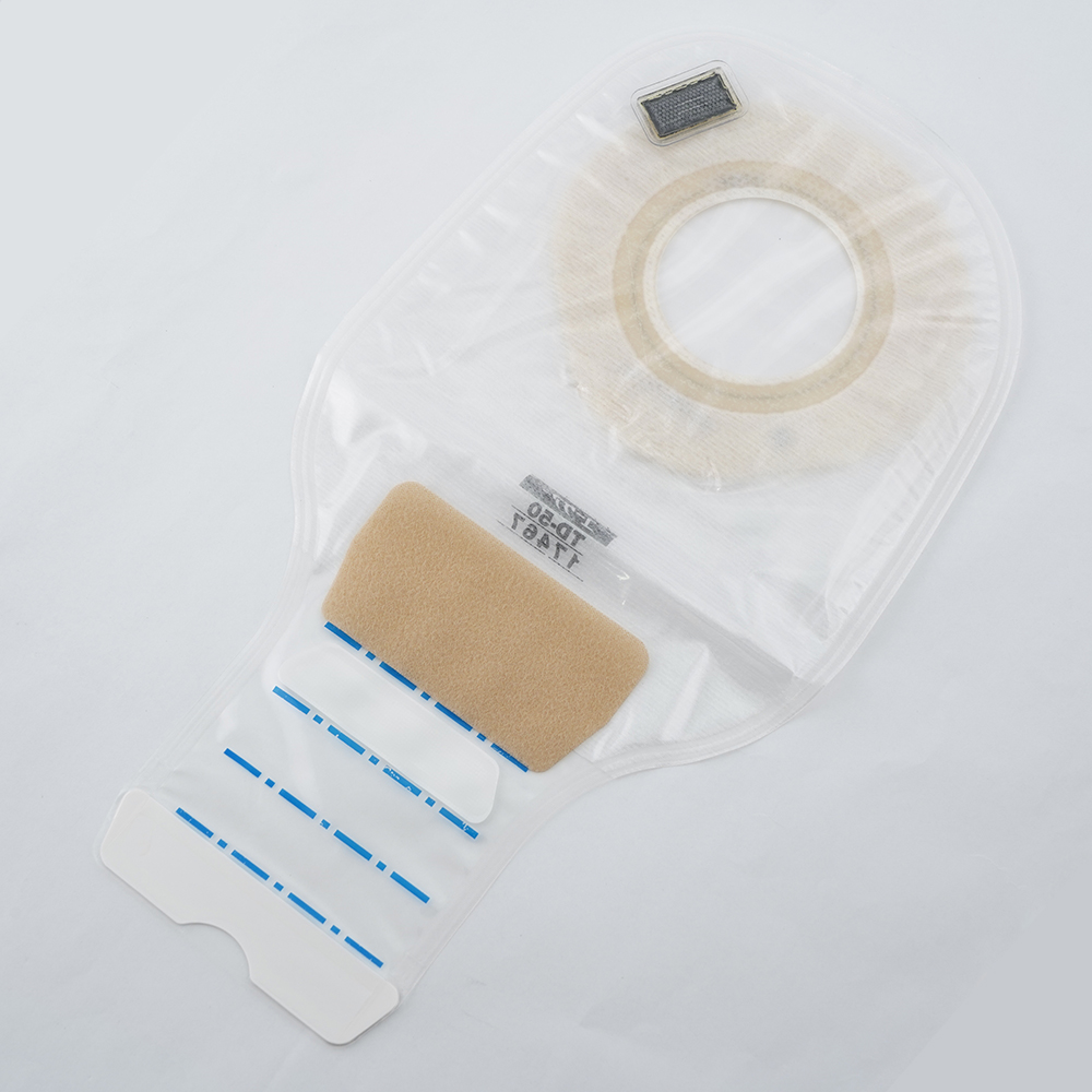 ●消化管ストーマ用。全体が平らな面板で、高さのあるストーマに適しています。下部に便排出口があるストーマ袋です。交換目安は2日。