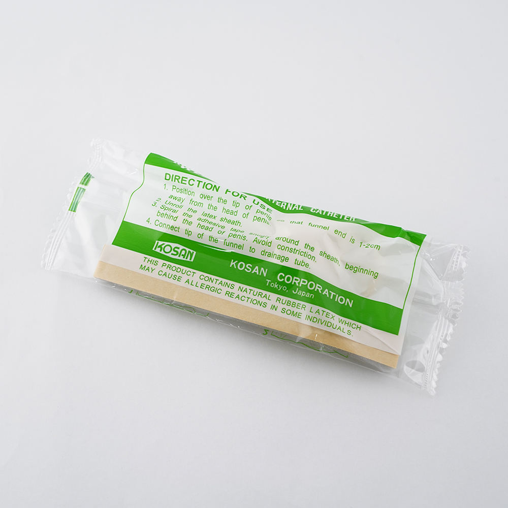 ●使用方法:薄いラテックスでできたコンドームタイプの採尿部にペニスを入れ、根元を付属の固定バンドで止めてください。採尿袋等連結パイプをコネクター部に差し込んで完全に接続します。