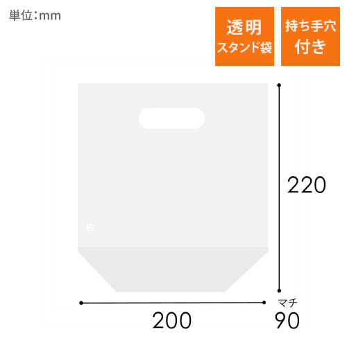 手抜きタイプの持ち手が付いた、幅200×高220mm(底マチ90mm)のポリ袋。