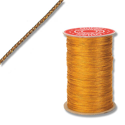 お祝いの贈答品にかけて結ぶ金色の組紐。サイズは約幅1mm×100m巻で、材質はラメ・レーヨンです。あらたまった場面での贈答品やお祝いの品にぴったり合う和テイストになっており、格式高い包装の仕上がりを実現します。慶事やお歳暮、お中元といった年中行事の贈答品のラッピングにいかがでしょうか。