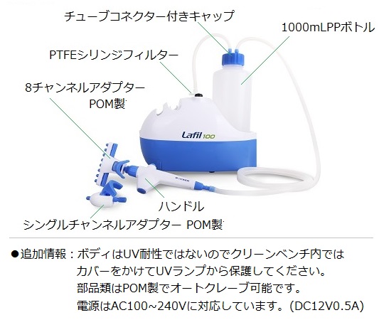 ●セット内容:ポンプ本体、シングルチャンネルアダプター、8チャンネルアダプター、ハンドル、1000mLPPボトル、チューブコネクター付きキャップ、PTFEシリンジフィルター、シリコンチューブ、ACアダプター