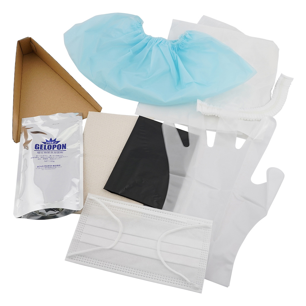 ●セット内容:外箱(チリトリ兼用)1個、嘔吐物凝固剤1袋(100g)、ペーパータオル1組、ヘラ1個、ポリ手袋1双、手提げポリ袋1枚、マスク1枚、靴カバー1組、キャップ1枚、エプロン1枚、イラスト付マニュアル1部