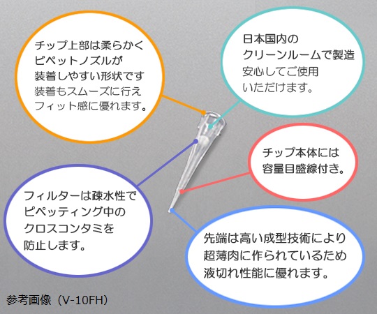 ●チップ上部は柔らかく、ピペットノズルが装着しやすい形状ですので装着もスムーズに行え、フィット感にも優れています。