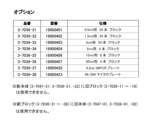●▼但し、15mL×8本用ブロック(3-7036-35)取付時はMAX800rpm、50mL×4本用ブロック(3-7036-36)取付時はMAX600rpm