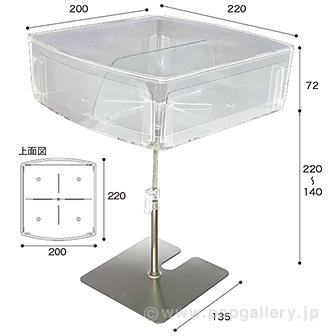 ●上部:H72×W200×D220mm●全長:H212~292mm●台座135mm角●耐荷重:約2.5kg●仕切板・POPホルダー用カバー付●POPホルダー付き。B6ハーフサイズまで対応。B8横POPを2枚並べて表示可能。(POPホルダー用カバー2枚付き)●商品分類と倒れ止めを兼ねた仕切板1枚付きで、薄い商品も立てて陳列することが可能。