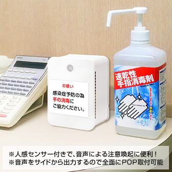 新型コロナウイルス感染症対策ツールとして、音声による注意喚起に大活躍!今までになかったサイドから音が出る音声POP!人感知センサー搭載のコンパクトボディで様々な場所に展開可能!