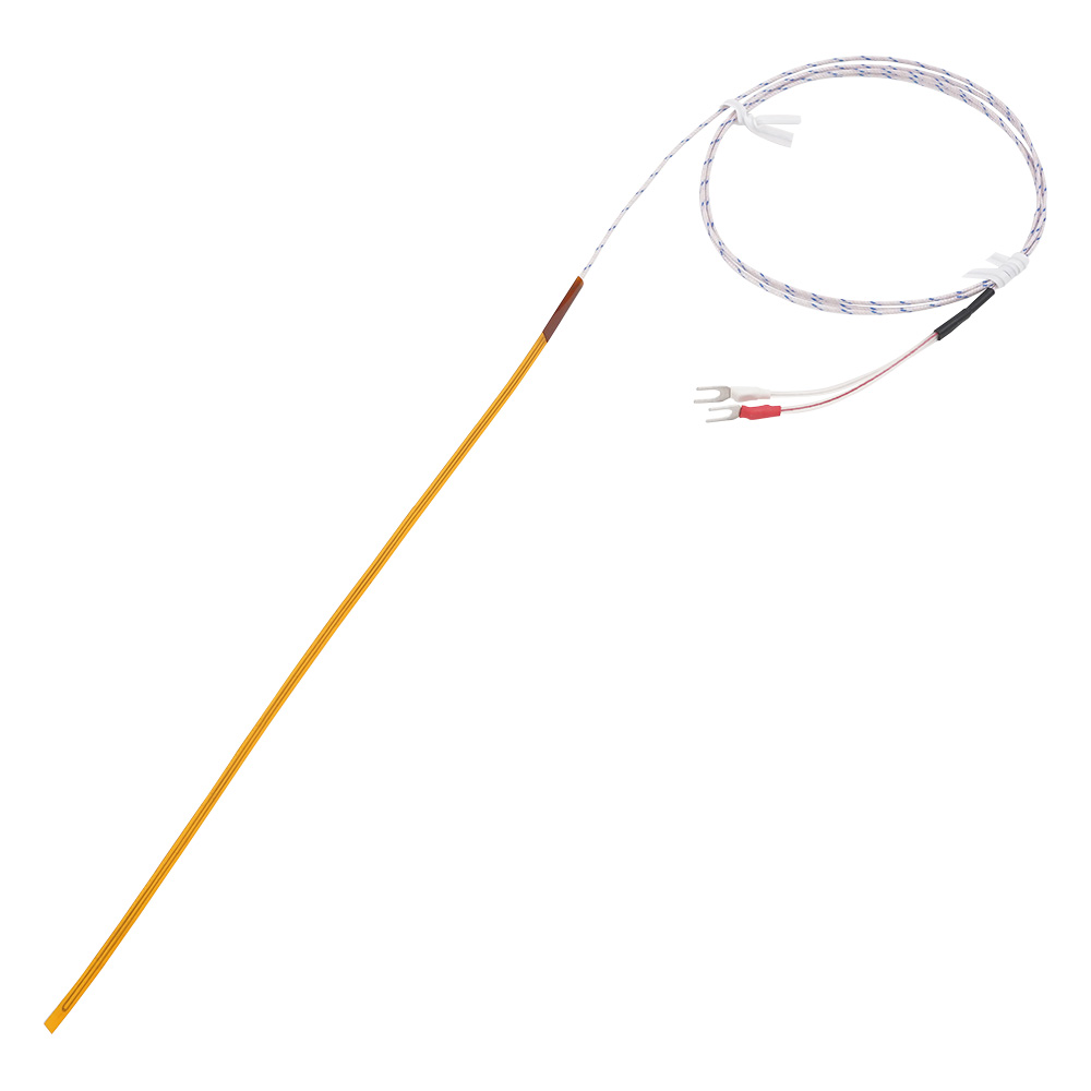 ●薄く細長いリボン状の熱電対をポリイミド樹脂でモールド加工した温度センサです。