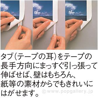 ●タブ(テープの耳)をテープの長手方向にまっすぐ引っ張って伸ばせば、壁はもちろん、紙等の素材からでもきれいにはがせます。