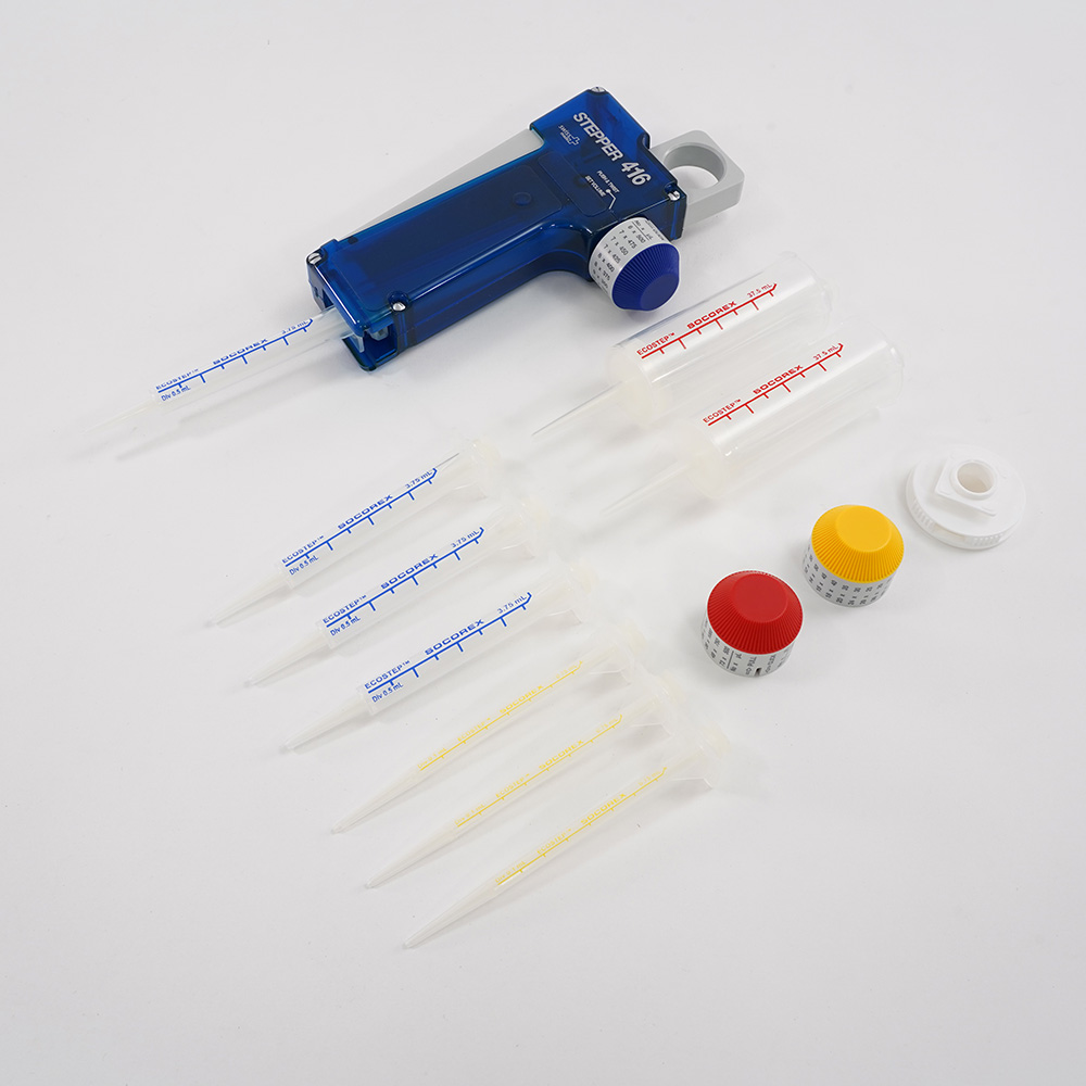 ●付属のステッパーつまみ・分注シリンジを交換するだけで、幅広い分注容量に対応します。