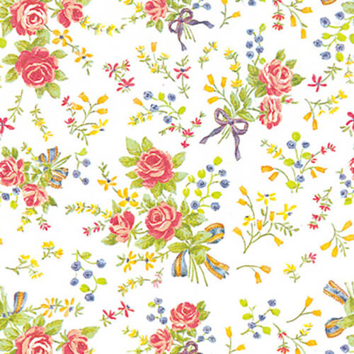 ツヤのある白い紙に赤いバラや野花の小さなブーケが散りばめられた楽しい雰囲気のデザイン。