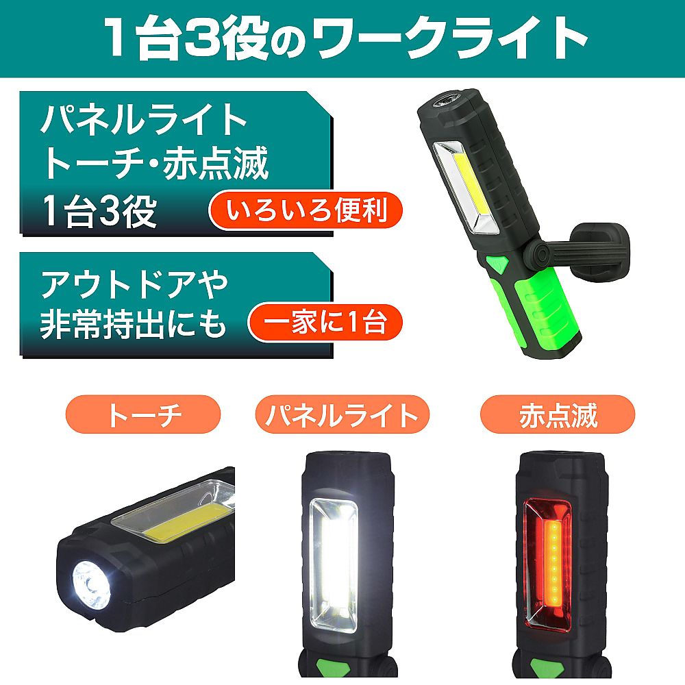 ●光源:パネル/白色COB LED×1灯、トーチ/白色LED×1灯、赤点滅/赤色COB LED×1灯