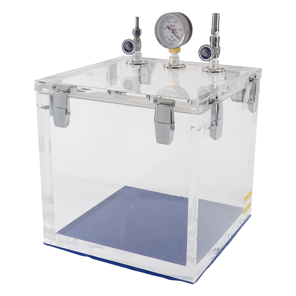 ●材質:透明強化PMMA(アクリル)(板厚:20mm)、バルブ・真空計取り付け部/ポリカーボネート