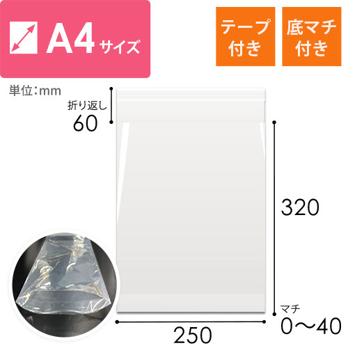 「CPP-BG-A4T」は、A4サイズのテープ付きCPP袋で、開封・封入作業を簡単にする便利なアイテムです。