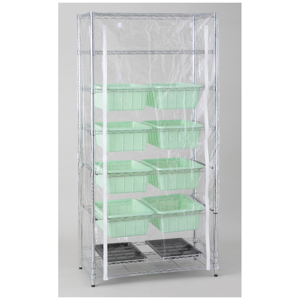 ●セット内容:ポール×4本、標準棚板×3枚、口の字バー×3枚、水受けトレー×2個、スライド式バスケット掛け・スライドバー×2段分、深型バスケット×8個、カーテン×1枚
