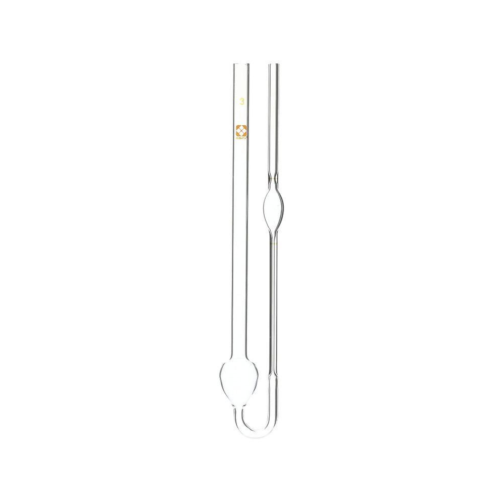 ●オストワルド粘度計は、比較測定に用いられる粘度計です。右図に示す下の球状部に5~8mLの範囲(常に一定体積)の液体試料を、ピペットなどを用いて入れてください。粘度計を標線Aの上方まで粘度計用恒温水槽に浸します。液体試料を標線Aの上方まで吸い上げた後、自然に流下させ、標線AからBまでの体積の液体試料が、毛細管を流下するのにかかる時間を測定します。同じ方法で、粘度既知の標準液を測定しますが、そのとき下の球状部に入れる液体の体積が同じになるように注意してください。毛細管径によって、No.1からNo.6まであります。比較測定用の相対粘度計です。球の容量は約3mLです。