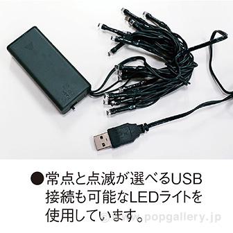 ●電池式20球LEDライト(ミックス)×1本付●単3電池×2本使用(別売)●省エネLED●常点と点滅が選べるUSB接続も可能なLEDライトを使用しています。●4本足★分割式で収納時はコンパクト!※リボンの柄・オーナメント等は、都合により多少変更になる場合がございます。予めご了承ください。