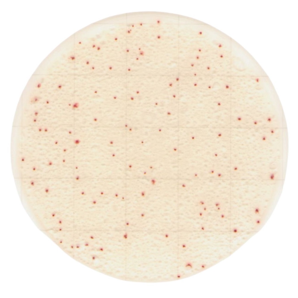 ●一般生菌のコロニーを明瞭な赤色に発色させ、検出するフィルム培地です。