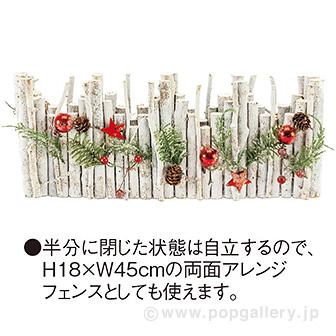 ●クリスマスアレンジが施されたデザインで目を引きます。●2ヶ使用し四角く囲んだ状態(対角線の内側):61cm●半分に閉じた状態は自立するので、H18×W45cmの両面アレンジフェンスとしても使えます。●真っすぐに伸ばして壁際に立て掛けたり、半分に閉じた状態で飾ってもGood!※白い粉が多少落ちる場合がございます。予めご了承ください。