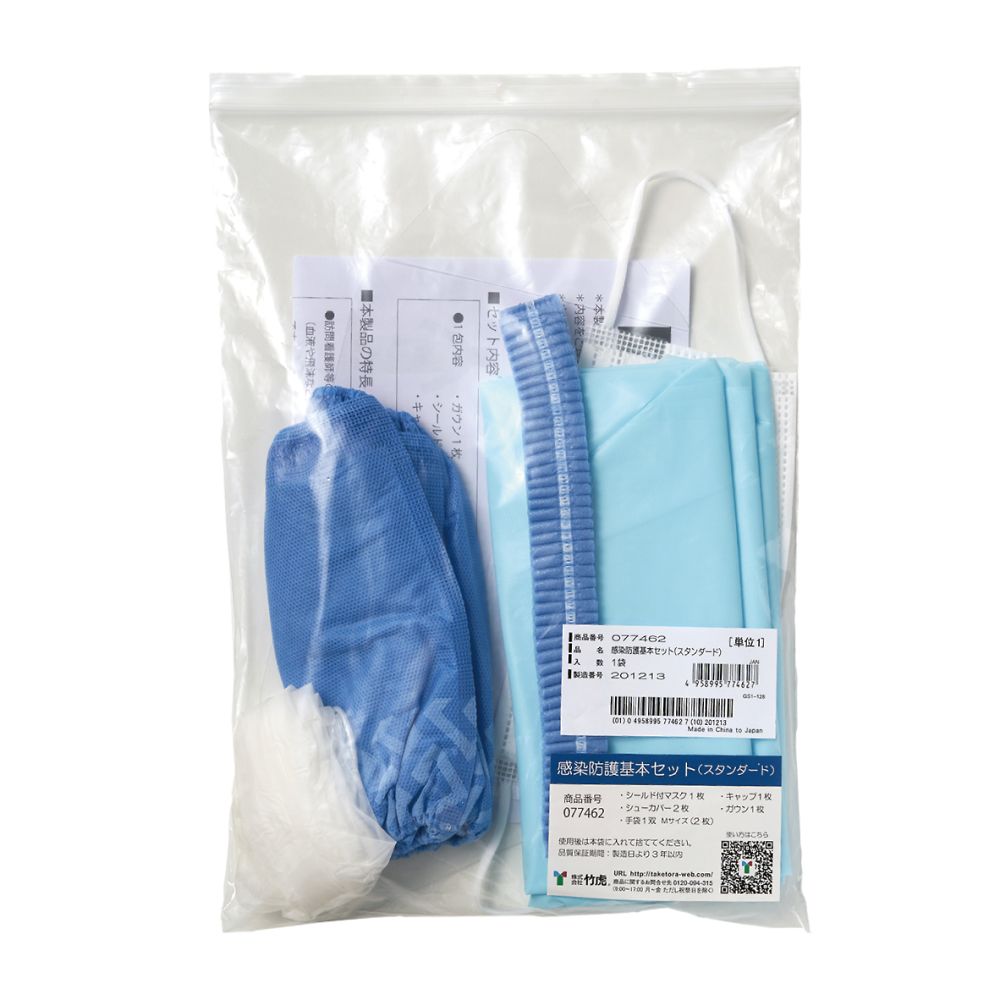 ●1袋内容:ビニールエプロン(ガウン)1枚、シールド付マスク1枚、キャップジャバラタイプ1枚、シューカバー2枚、プラスチック手袋M(パウダーフリー)2枚
