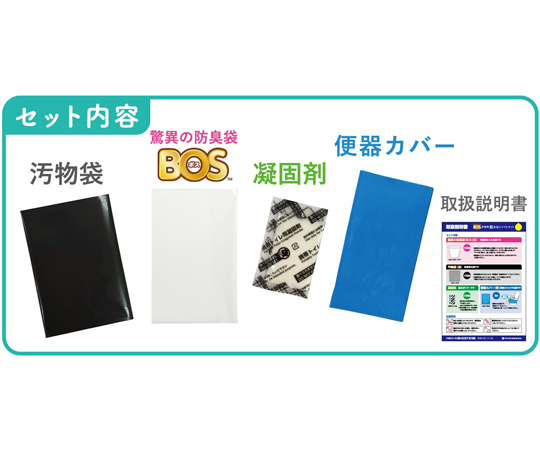 ●セット内容:防臭袋BOS(白)×50枚(35×50cmマチ付)、凝固剤×50袋(1袋あたり10g)、汚物袋(黒)×50枚(70×70cm)※開口部の外周140cm、便器カバー(青)2枚(65×80cm)※開口部の外周130cm、取扱説明書×1枚