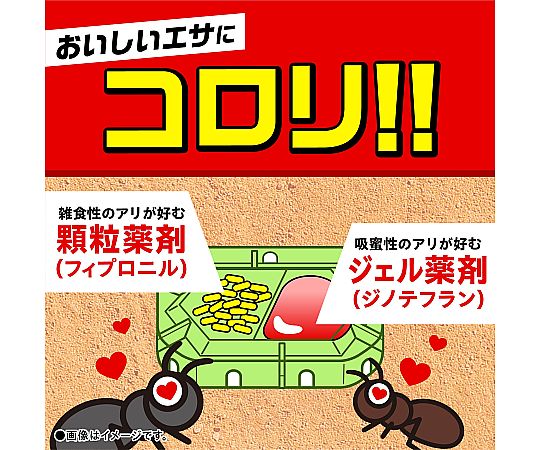 ●▼アリが大好きな甘い黒みつを配合。アリを誘引し、道しるべフェロモンの働きで仲間のアリにエサ(薬剤)のありかを教えます。
