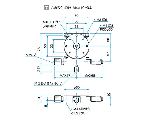 ●粗動はステージ上面を直接回転させ、微動は粗動部分をクランプし、マイクロメータヘッド又はファインピッチスクリュー(±5°)で行います。