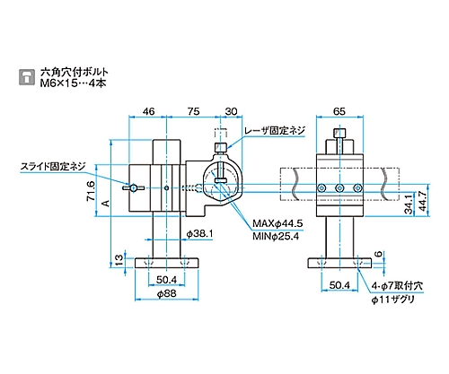 ●V溝とレーザ固定ネジで外径φ25.4~φ44.5mmの円筒を固定することができます。
