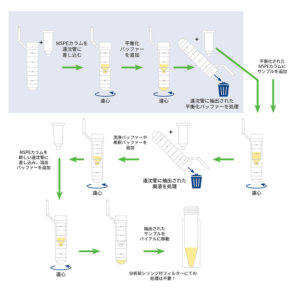 ●吸着剤とフィルターが統合されているため、遠心処理後のサンプルをシリンジフィルターに通す必要はございません。