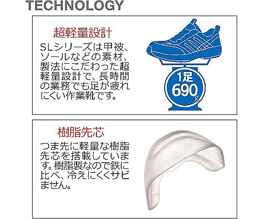 ●SLシリーズは甲板、ソール等の素材、製法にこだわった軽量設計で、長時間の業務でも足が疲れにくい作業靴です。
