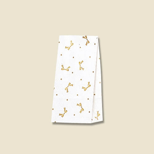 材質は晒クラフト紙60g、色は白ベースに可愛いリボンを散りばめた定番のデザインです。