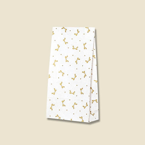 材質は晒クラフト紙60g、色は白ベースに可愛いリボンを散りばめた定番のデザインです。