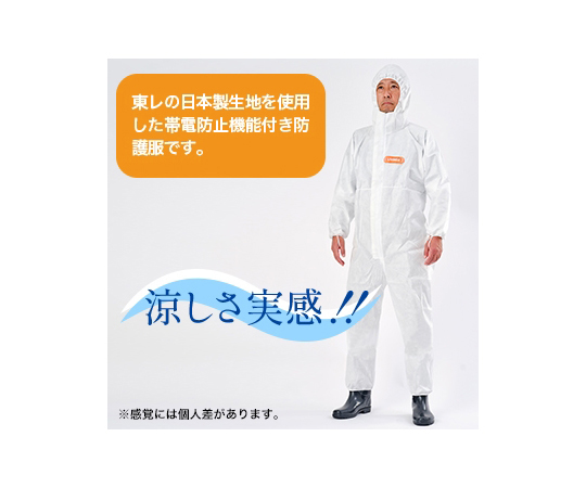 ●独自のSMS 製法※2 により粉じん防護性と耐水圧1,000mmH₂O※3 に加え、通気性、帯電防止機能を有する新しいタイプの防護服です。