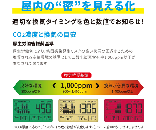 ●適切な換気タイミングを色と数値でお知らせする二酸化炭素濃度測定器(NDIR方式)。