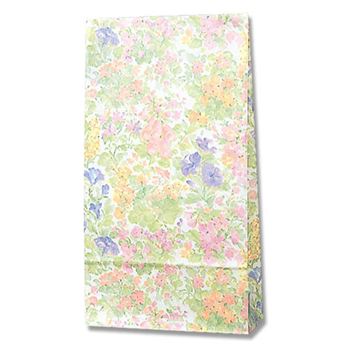 材質は晒クラフト紙70g、色は白地で全面にカラフルな花柄が入った高級感のあるデザインです。