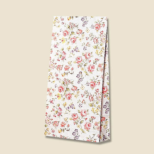 材質は晒クラフト紙60gで、白地に綺麗な花柄がある落ち着いた雰囲気のデザインです。