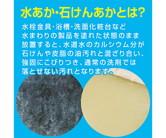 ●※水あか・石けんあかとは:水道水に含まれるカルシウム分が石けんなどと混じり合い白ボケしたようにこびりついたもの。また、ステンレス製シンクのサビや金属製品から移ったもらいサビの除去に。