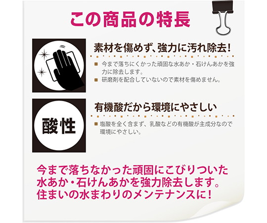 ●「驚きの洗浄力」でこれまで中性洗剤では落ちなかったシンクの水あか・石けんあか・サビを落とします。