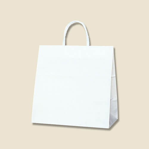 マチがワイドな手提げ紙袋。材質は片艶クラフト紙120gで、色は汎用性の高い白無地になっており、ショップラベルやギフトシールなどでのアレンジが簡単にできます。袋口を内側に折り返し、底にボール紙を入れて強度を持たせた丈夫な作りです。紐タイプは白色のPP紐。樹脂製の接着剤で取り付けているため、紐の結び目がなく、物の出し入れがスムーズにでき、ストックする際にかさばりません。立てることができない箱もの商品の持ち運びに最適です。
