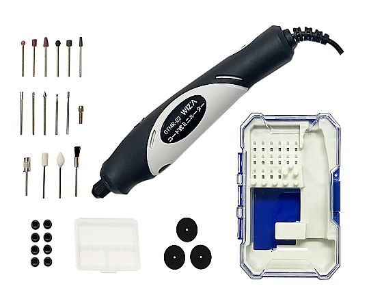 ●付属品1:軸付砥石(GC材)×3、軸付砥石(WA材)×3、ダイヤビット×3、ハイスカッター×2、パフ×2、電源アダプター×1