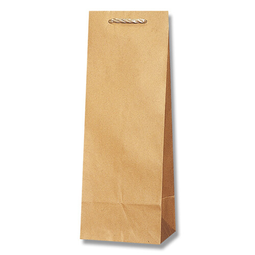この手提げ紙袋は、茶色の無地デザインが特徴で、厚手でしっかりとした作りになっています。サイズはスリムなボトルを入れるのに最適なサイズ感です。袋口と底面には強度を上げるためのボール紙が付いており、安心して商品を入れることができます。