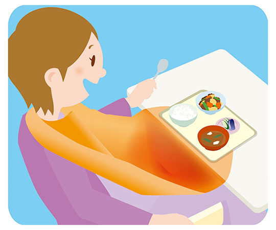 ●ワイドポケット&ロング丈 ワイド設計のため、脇からの食べこぼしもしっかりキャッチ。衣服やシーツ、床の汚れを防ぎます。ロング丈のため、食事用トレーの下にしっかりはさむことができ、リクライニングにもゆとりを持ってお使いいただけます。